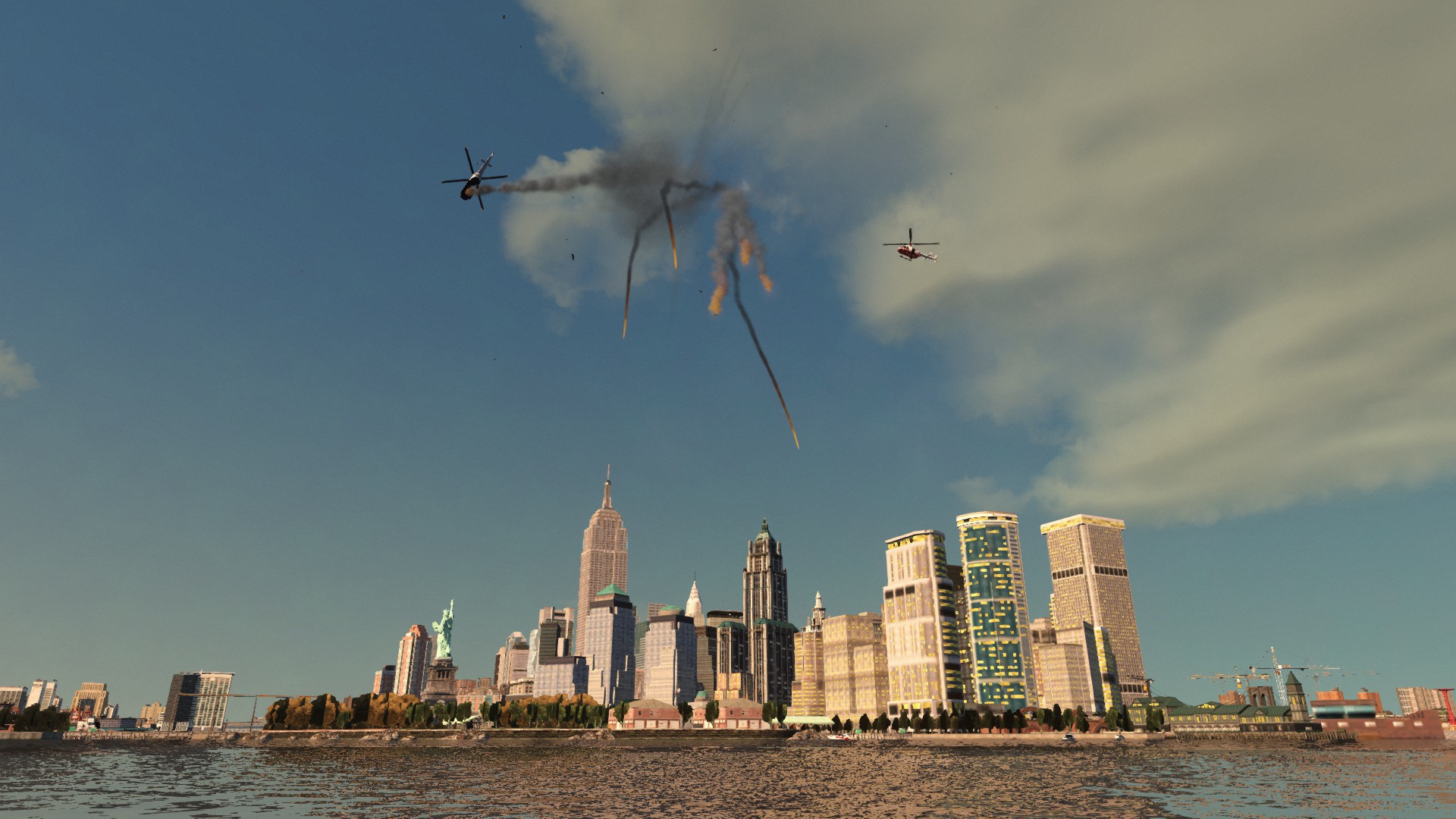 Mid-air helicopter explosion above the sea.