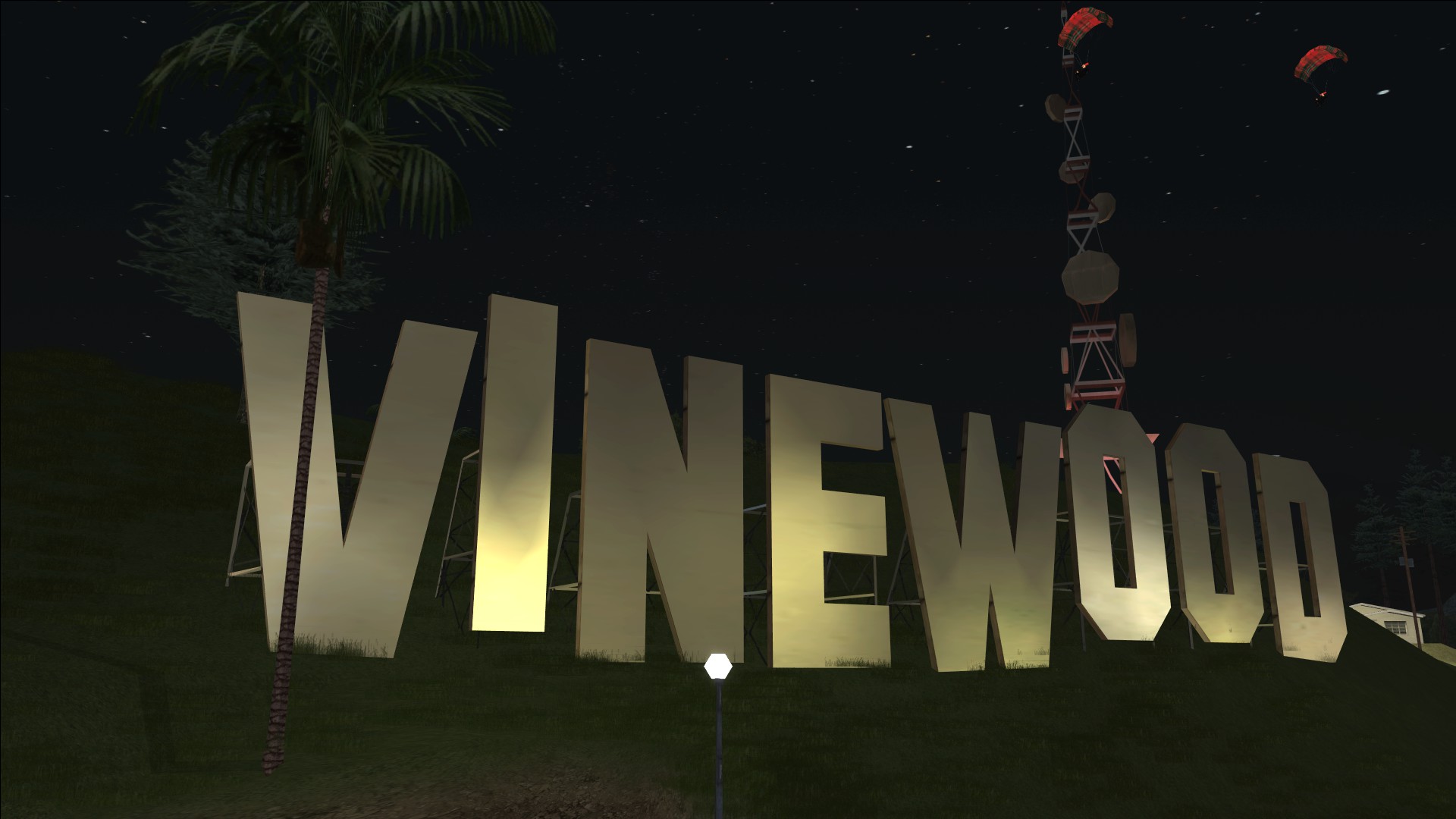 Nighttime shot of the iconic Vinewood sign.