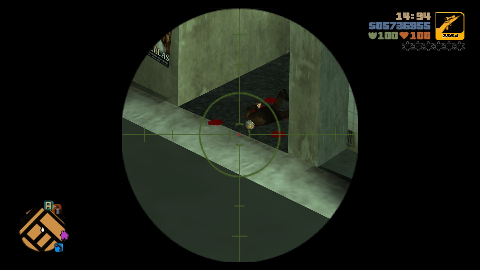Grand Theft Auto III: An old man fell down. The sniper scope in the picture is completely unrelated to this. Maybe.
